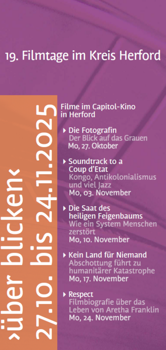 Auch dieses Jahr finden die Herforder Filmtage statt und die Herforder Gruppe ist wieder mit dabei. Die 19. Filmtage mit dem Titel “über blicken” starten am 27. Oktober 2025. Wir freuen uns, auch in diesem Jahr mit dem Film „Die Saat des heiligen Feigenbaums“ im Capitol-Kino in Herford am 10.11. 2025 um 19:30 einen interessanten Film anbieten zu können. Inhalt: